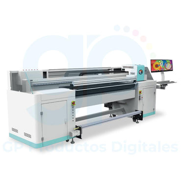 Impresora de híbrida para materiales rígidos y flexibles, tecnología de curado UV, con tinta blanca, color y barniz, 1.80m x largo del material, con capacidad de 1 a 4 cabezales i3200 o Ricoh G5i, alta velocidad, calidad fotográfica, alta duración y bajo costo por metro cuadrado.